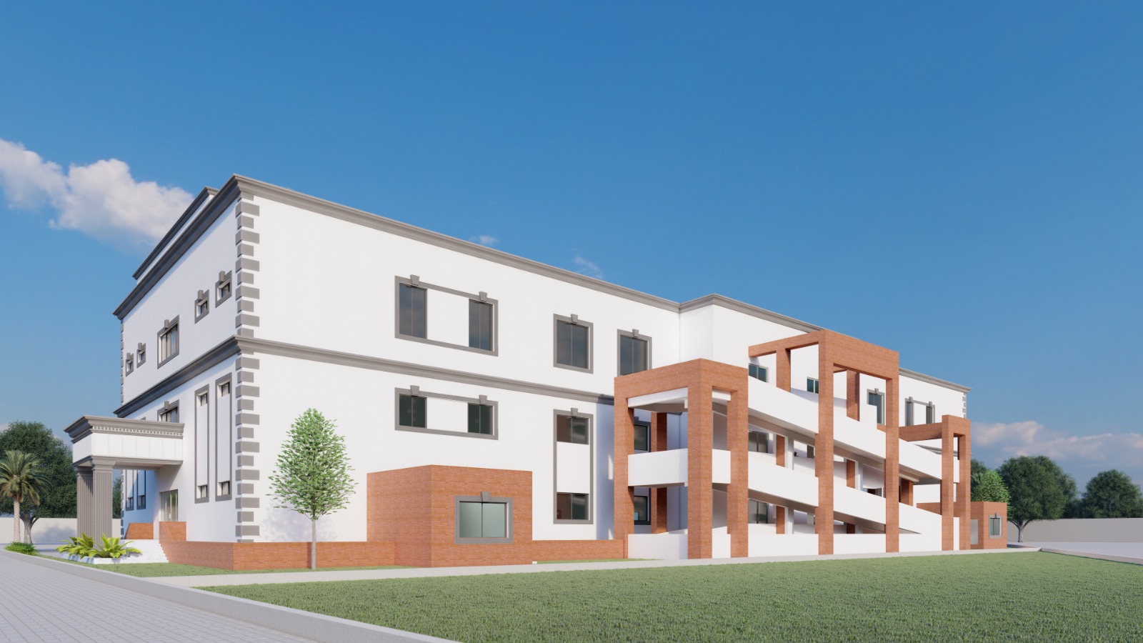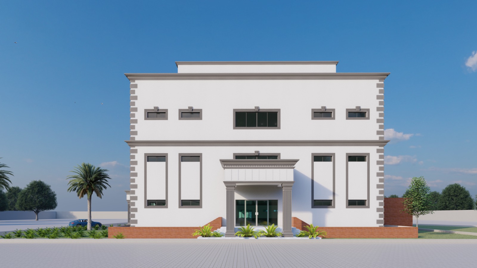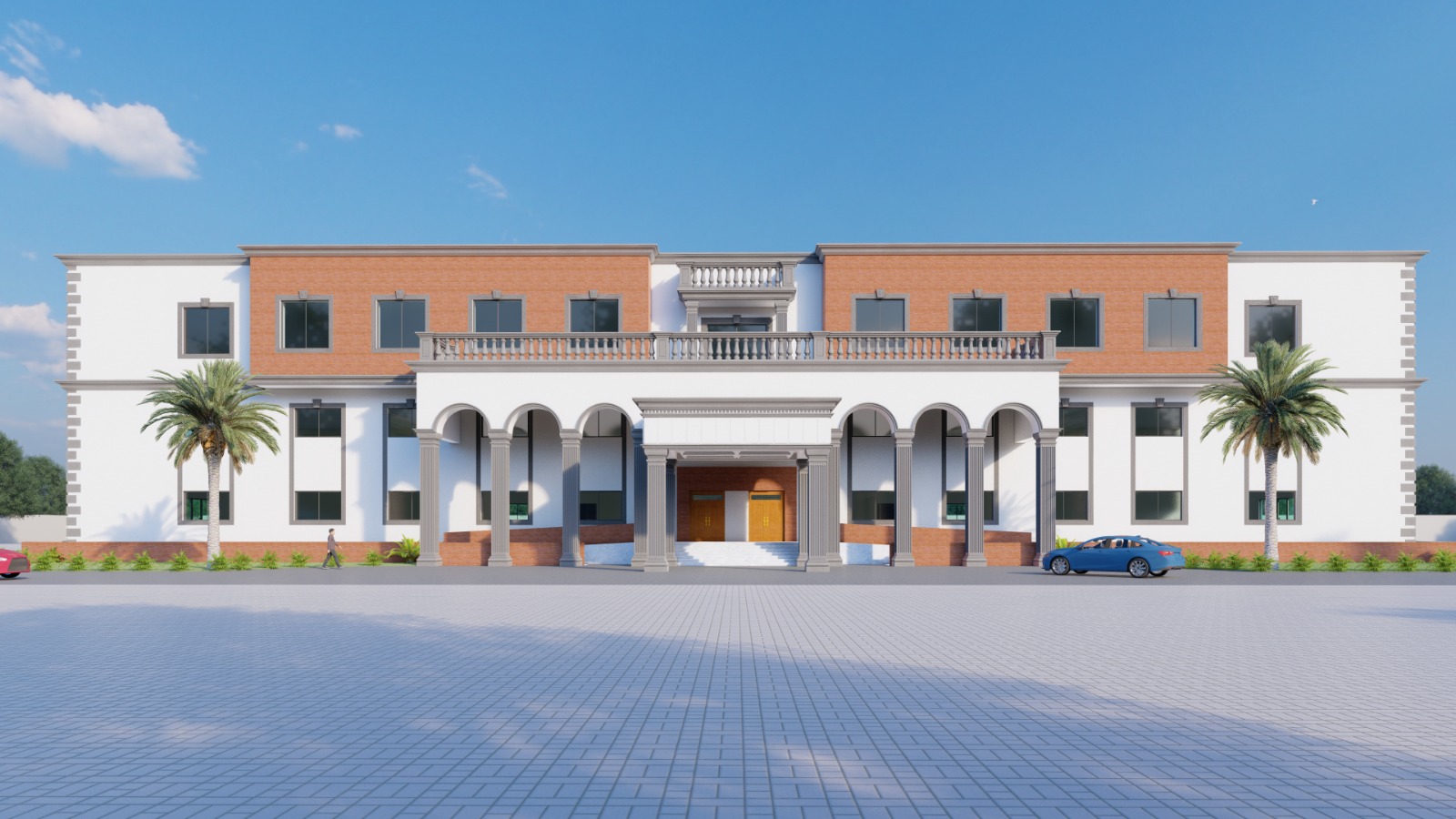 This grand neoclassical building features a symmetrical facade with white walls and brick accents. Tall arched columns frame the entrance, adding elegance and sophistication. A spacious tiled courtyard enhances the approach, complemented by lush palm trees. The upper-level balcony and decorative railings complete the stately design.