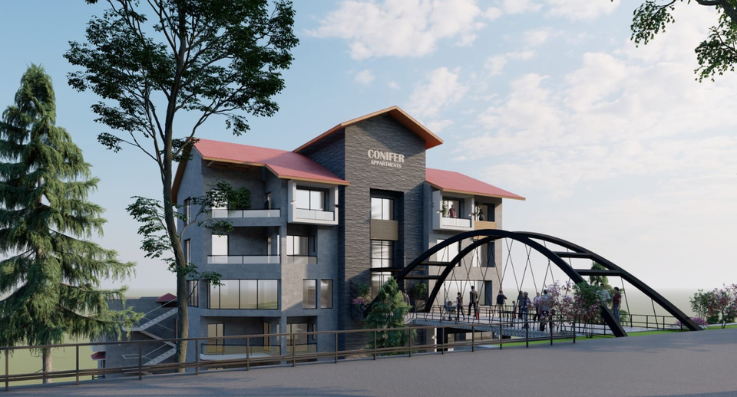BiZBrainZ presents Conifer Apartments, a modern residential development that blends contemporary architecture with natural aesthetics. The design features a distinctive sloped red roof, a bold entrance bridge, and spacious balconies that invite ample natural light. The façade incorporates a mix of textured concrete and wooden panels, adding warmth and character to the building. Surrounded by lush greenery and thoughtfully landscaped areas, Conifer Apartments offer a serene and sophisticated living experience.