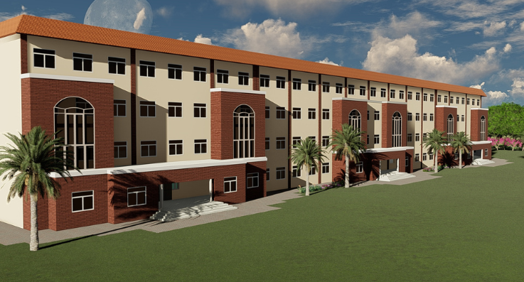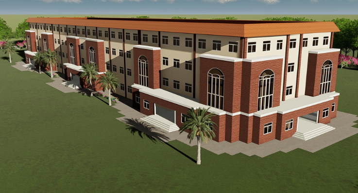 BiZBrainZ presents a modern institutional building designed for education, research, or administration. Its symmetrical design features a grand central entrance, flanked by two identical wings for balance and prestige. The brick and beige facade, arched windows, and terracotta roof blend classic and contemporary styles. A vast green landscape with palm trees, wide walkways, and open lawns creates a serene environment. This thoughtfully designed space enhances productivity and architectural grandeur.