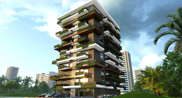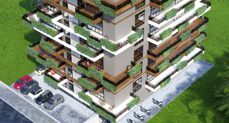 BiZBrainZ has designed a premium residential complex in DHA, integrating modern architecture with eco-friendly elements. The high-rise apartment building features spacious balconies adorned with lush greenery, promoting a sustainable and refreshing living experience. The exterior combines sleek contemporary materials with warm wooden textures, creating a sophisticated aesthetic. The design emphasizes open spaces, natural lighting, and a seamless connection with the surrounding urban landscape, offering a perfect blend of luxury and comfort.